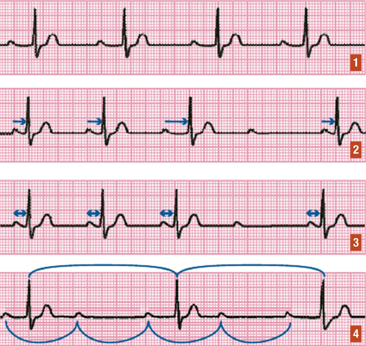 . BAV 2 en 2/1 : chaque onde P donnant un QRS est suivie d’une onde P bloquée. Il peut alors s’agir d’un BAV 2 Mobitz 1 (avec l’intervalle PR qui s’est tellement allongé d’un coup que la 2e onde P se retrouve d’emblée bloquée) ou d’un BAV 2 Mobitz 2 avec une onde P bloquée de manière intermittente une fois sur 2.