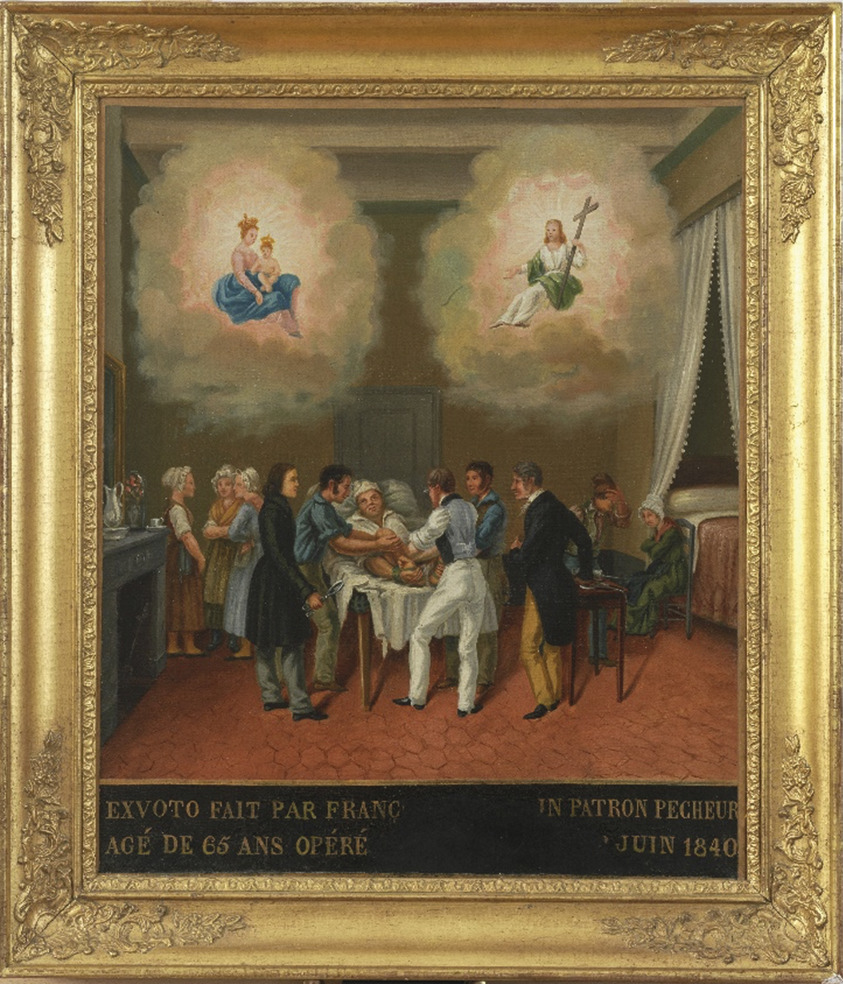 Un ex-voto alsacien de 1810*, conservé à l’ermitage de Saint- Florent à Oberhaslach montre chastement un malade étendu sur un matelas lui-même posé sur une table, sous la protection de saint Florent dont la main gauche laisse passer des rayons de bénédiction. Le saint et sa gloire occupent, comme c’est l’usage, le haut du tableau, mais le domaine du sacré n’est pas nettement séparé du domaine du profane, le décor de la chambre d’opération n’étant qu’à peine suggéré.